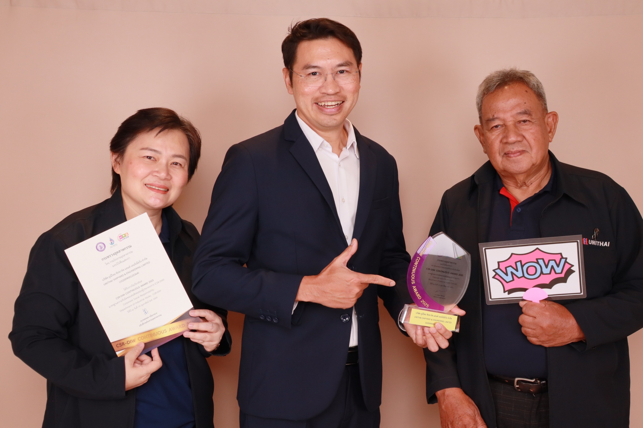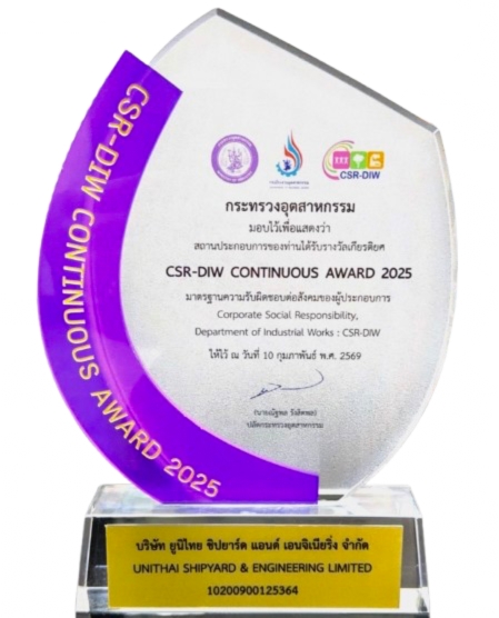 บริษัทยูนิไทยชิปยาร์ดฯ ได้รับรางวัลสถานประกอบการที่มีความรับผิดชอบต่อสังคม ต่อเนื่องเป็นปีที่ 15 จากโครงการส่งเสริมโรงงานอุตสาหกรรมให้มีความรับผิดชอบต่อสังคมและชุมชน เพื่อยกระดับอุตสาหกรรมดี อยู่คู่ชุมชนอย่างยั่งยืน (CSR DIW to MIND for Sustainability) ประจำปี 2568 จากกรมโรงงานอุตสาหกรรม กระทรวงอุตสาหกรรม
